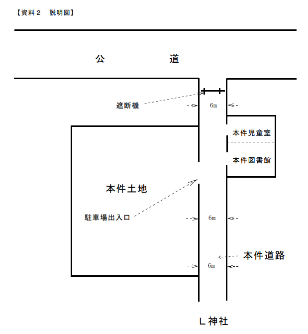 弁護士K:本件道路は、L神社の参道なのですが、B県知事から幅員6メートルの道路として位置指定を受けており、いわゆる位置指定道路に当たるそうです。L神社では、参道への違法駐車が後を絶たないことから、本件道路が公道に接する部分に遮断機を設置しているとのことです。